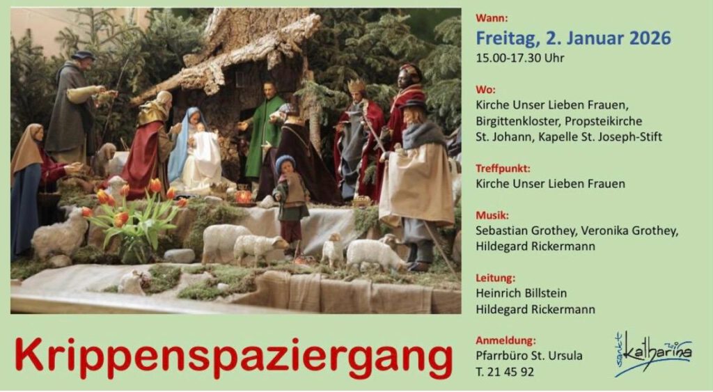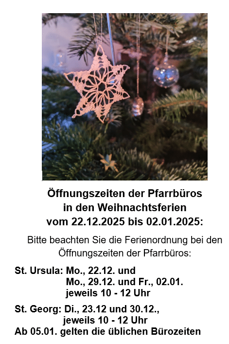 24.12. 14.30 Uhr Krippenfeier für junge Familien in Georg // 16.00 Uhr Wortgottesfeier mit Krippenspiel in Georg // 16.30 Uhr Krippenfeier mit Krippenspiel von Jugendlichen in St. Ursula // 18.00 Uhr Wortgottesdienst Josephstift // 18.00 Uhr Christmette in St. Georg // 22.00 Uhr Christmette in St. Ursula