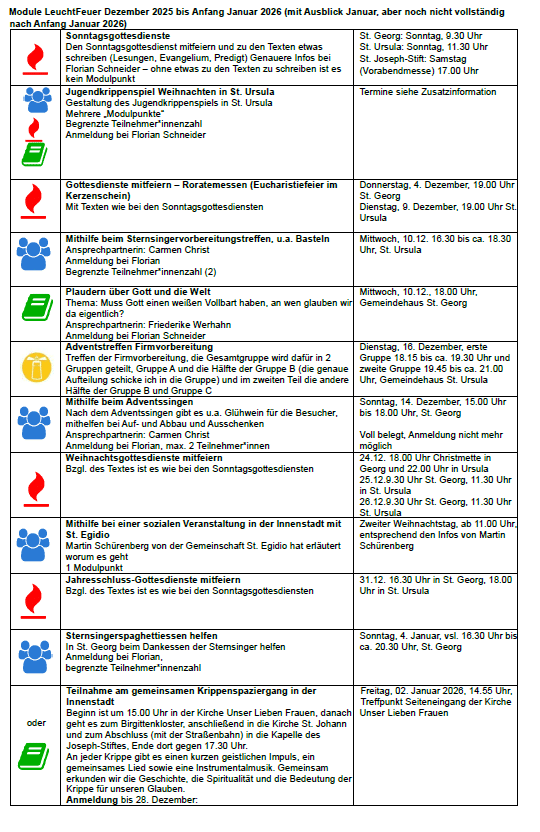 Im Advent wird es ein Treffen als Adventstreffen geben. Dafür wird die Gruppe in vsl. 2 Gruppen aufgeteilt. Ab Januar teilt sich die Firmgruppe in vsl. 3 Kleingruppen A, B und C mit mehreren Treffen von Januar bis Mai.