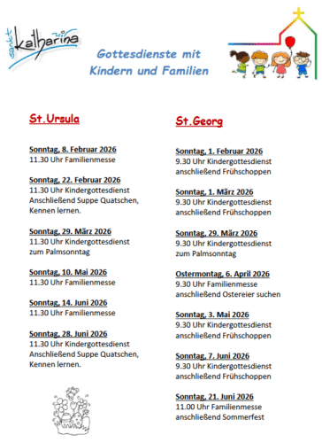 In unseren Kirchen St. Ursula und St. Georg gibt es regelmäßige Angebote vom Familienmessen und parallelen Kindergottesdiensten. Zur Vorbereitung dieser Gottesdienste gibt es an jedem Standort eine Gruppe von Eltern und Interessierten, die jederzeit offen ist für neue Leute.